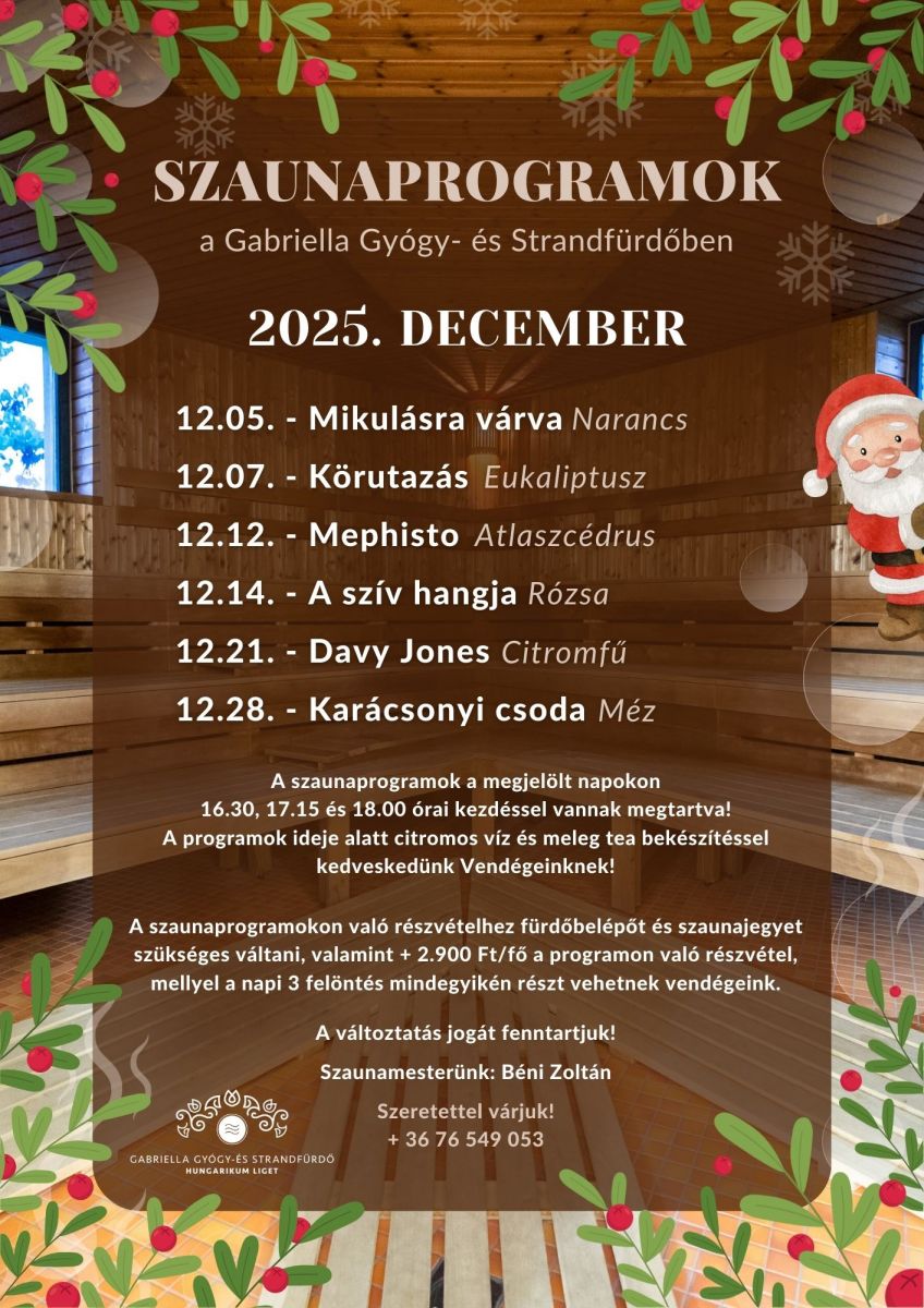 A téli időszak ideális arra, hogy egy kis melegedésre és regenerálódásra időt szakítsanak. Decemberi szaunaprogramjaink nemcsak kellemes kikapcsolódást kínálnak az ünnepi időszakban, hanem segítenek élvezni a szauna jótékony, átmelegítő és felfrissítő hatásait is.