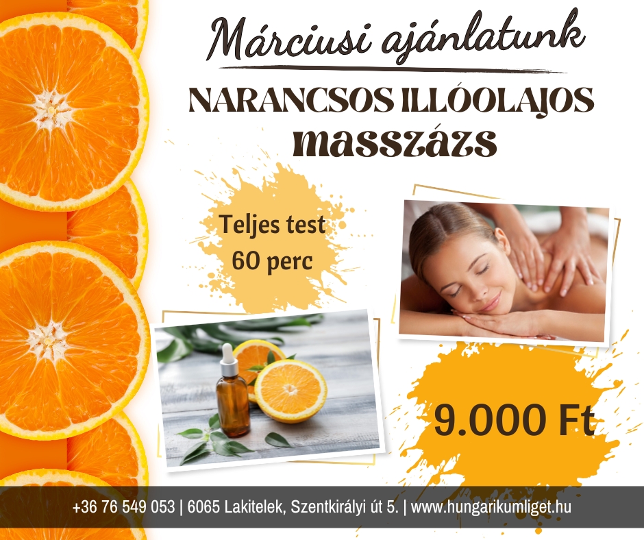 Szeretne kipróbálni egy kellemes és frissítő kezelést? Szívből ajánljuk narancsos illóolajos masszázsunkat, amely a narancs illóolaj jótékony hatásait ötvözi a masszázs relaxáló erejével.