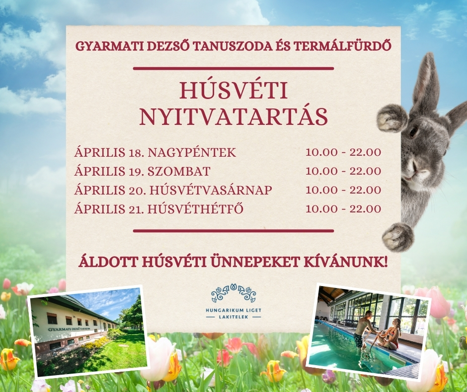 Tájékoztatjuk Önöket, hogy a húsvéti ünnepek alatt a Gyarmati Dezső Tanuszoda és Termálfürdő hétvégi nyitvatartással üzemel.