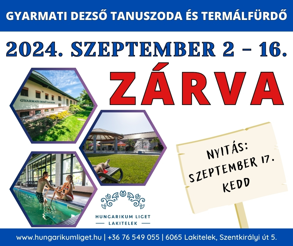 Tájékoztatjuk Önöket, hogy a Gyarmati Dezső Tanuszoda és Termálfürdő kettő teljes hétig, 2024. szeptember 2-16-ig zárva tart.