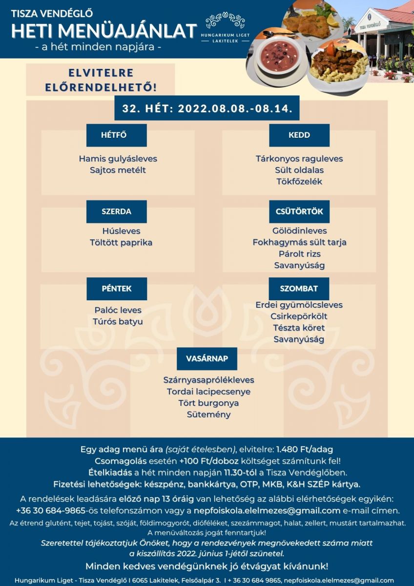 Tisza Vendéglő heti menü ajánlata 2022. 08. 08. - 08. 14.