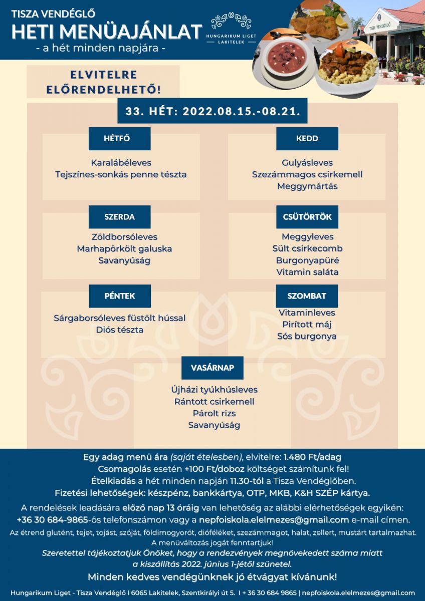 Tisza Vendéglő heti menü ajánlata 2022. 08. 15. - 08. 21.