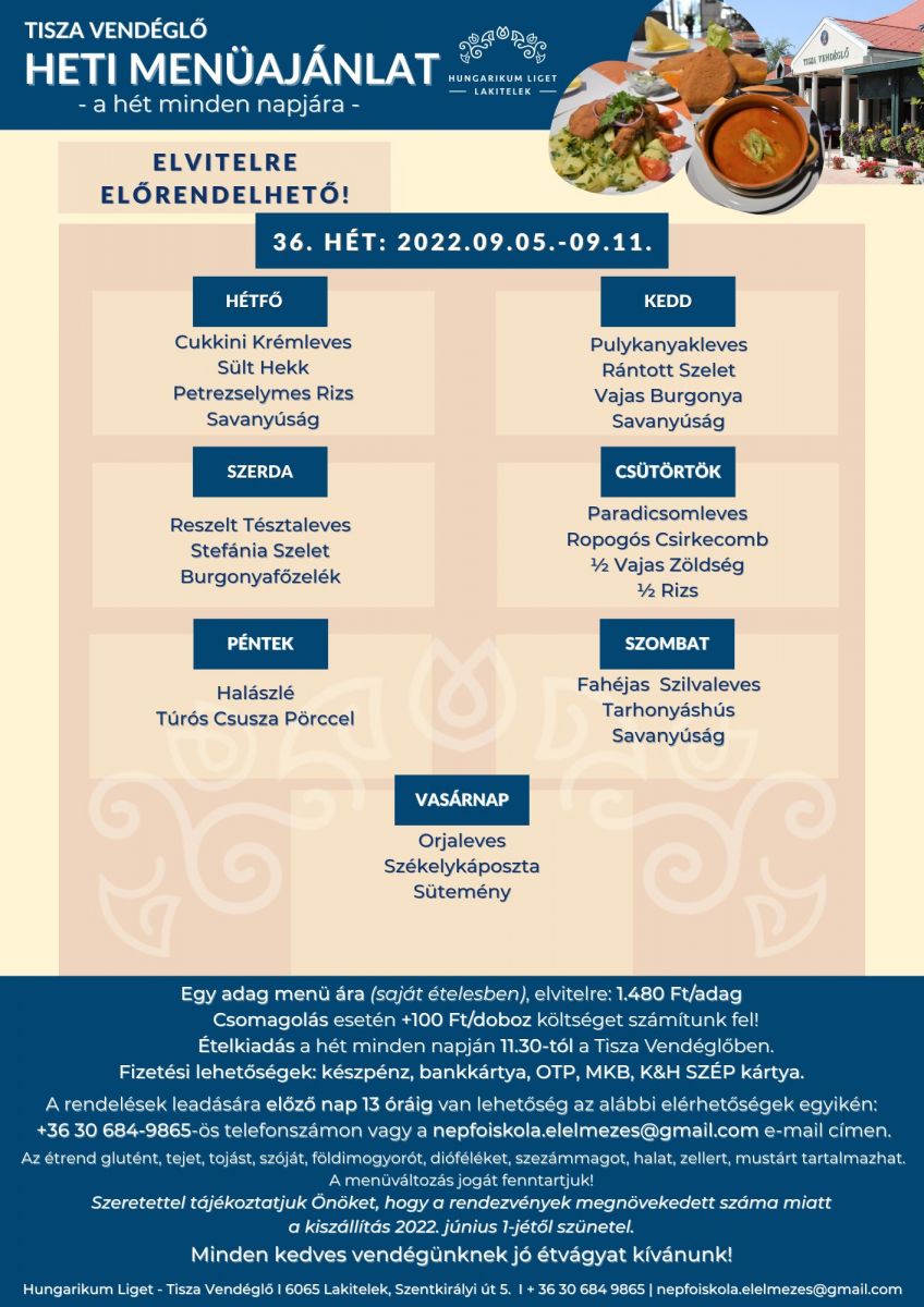Tisza Vendéglő heti menü ajánlata 2022. 09. 05. - 09. 11.
