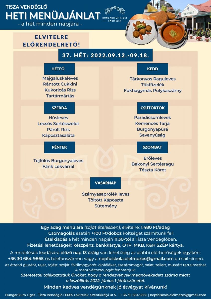 Tisza Vendéglő heti menü ajánlata 2022. 09. 12. - 09. 18.