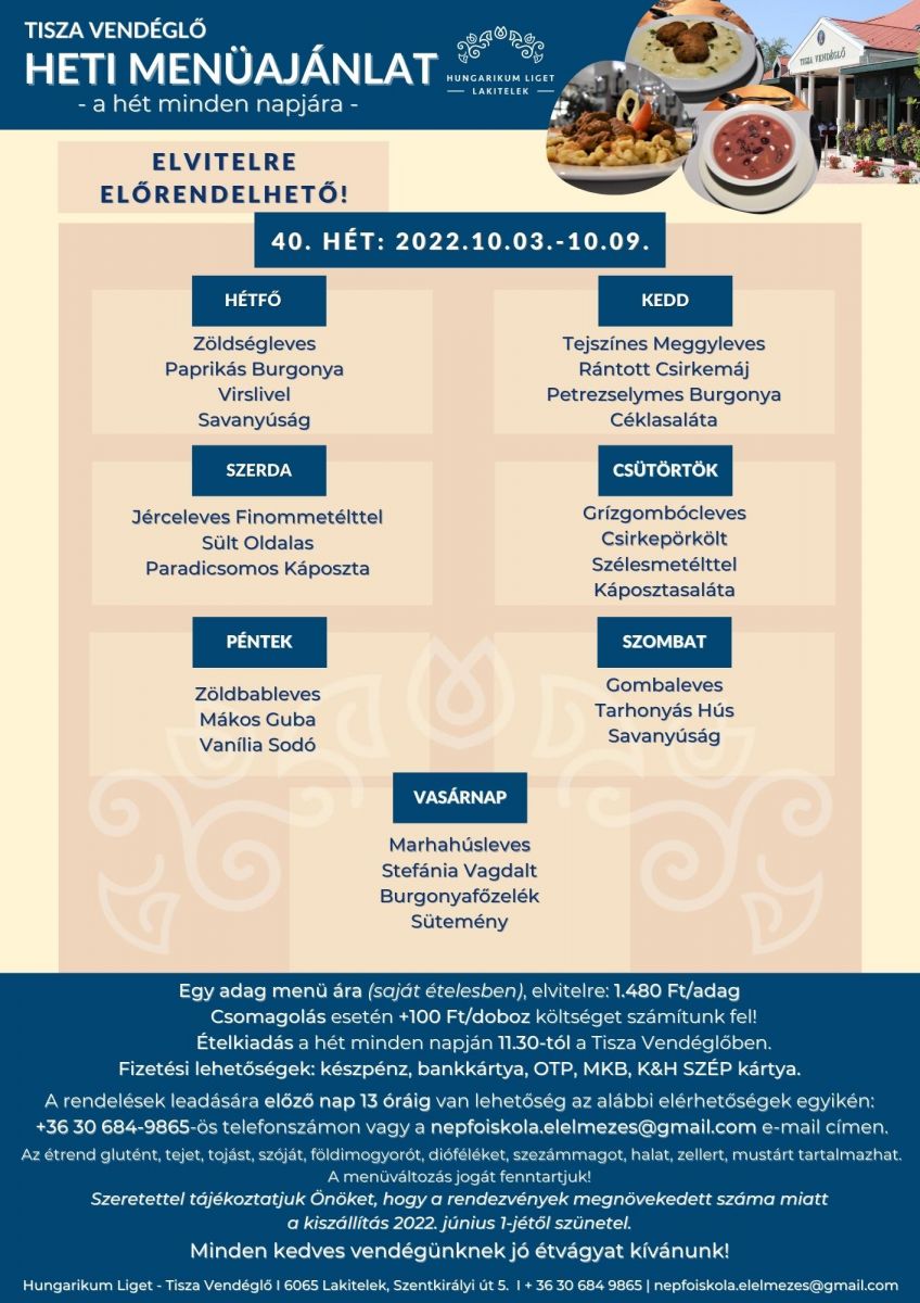 Tisza Vendéglő heti menü ajánlata 2022. 10. 03. - 10. 09.