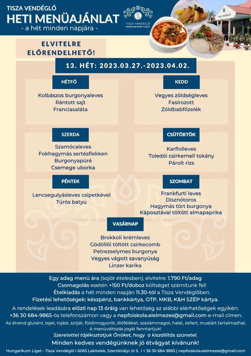 Tisza Vendéglő heti menü ajánlata 2023. 03. 27. - 2023. 04. 02.