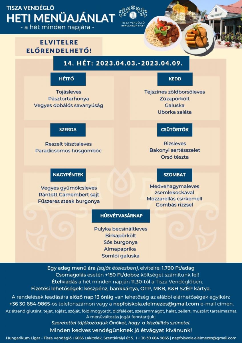 Tisza Vendéglő heti menü ajánlata 2023. 04. 03. - 2023. 04. 09.