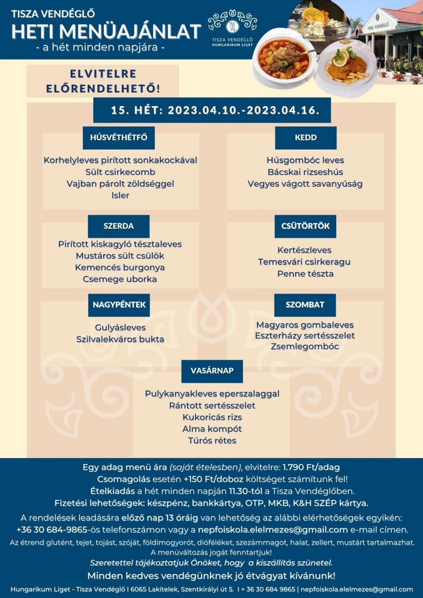 Tisza Vendéglő heti menü ajánlata 2023. 04. 10. - 2023. 04. 16.