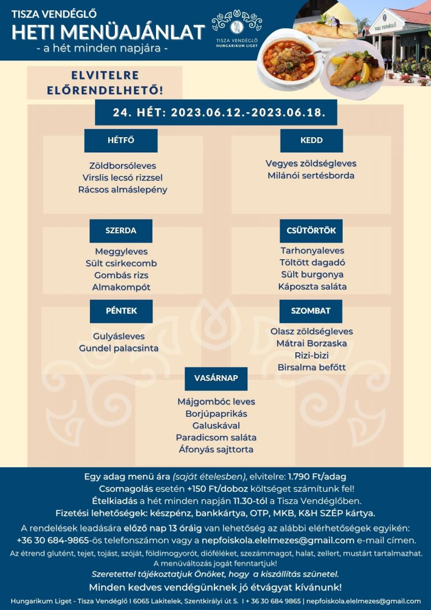 Tisza Vendéglő heti menü ajánlata 2023. 06. 12. - 2023. 06. 18.