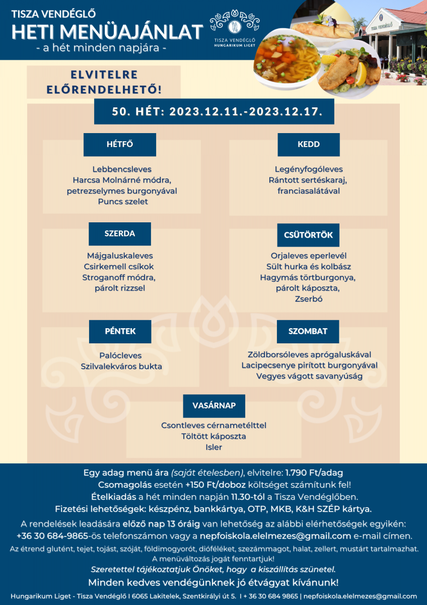 Tisza Vendéglő heti menü ajánlata 2023.12.11. - 2023.12.17.