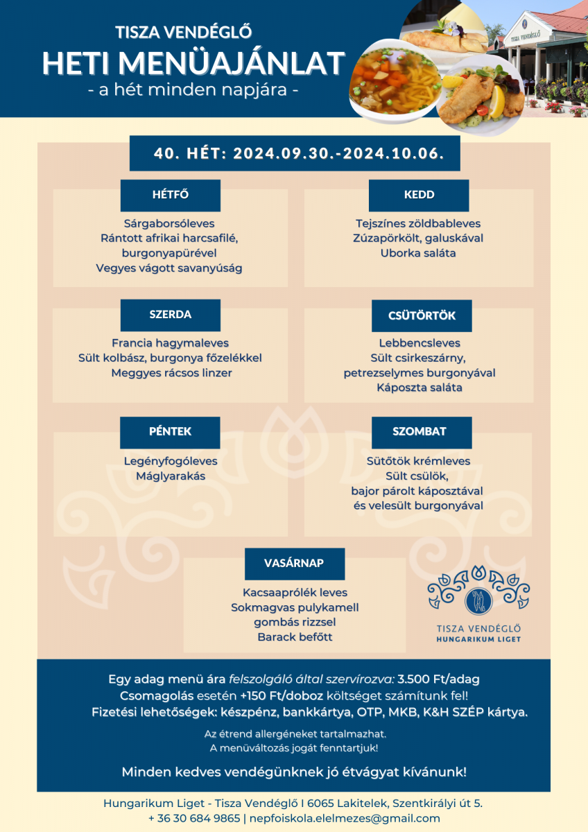 Tisza Vendéglő heti menü ajánlata 2024.09.30.-2024.10.06.