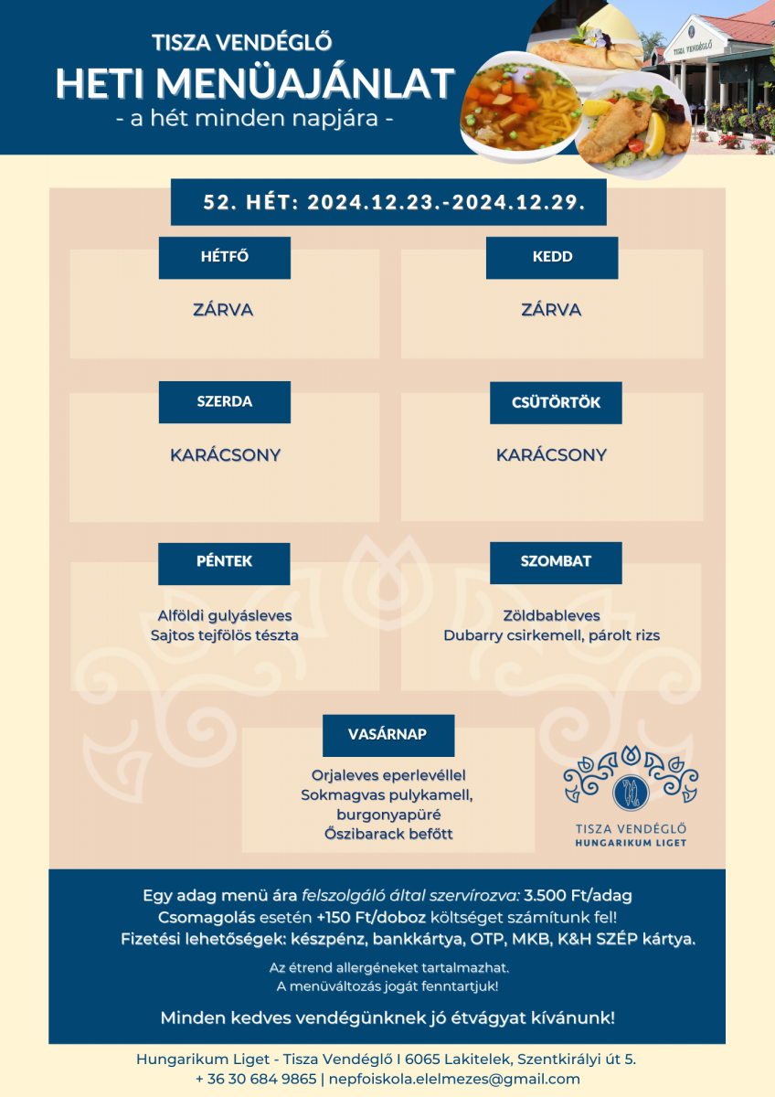 Tisza Vendéglő heti menü ajánlata 2024.12.23.-2024.12.29.