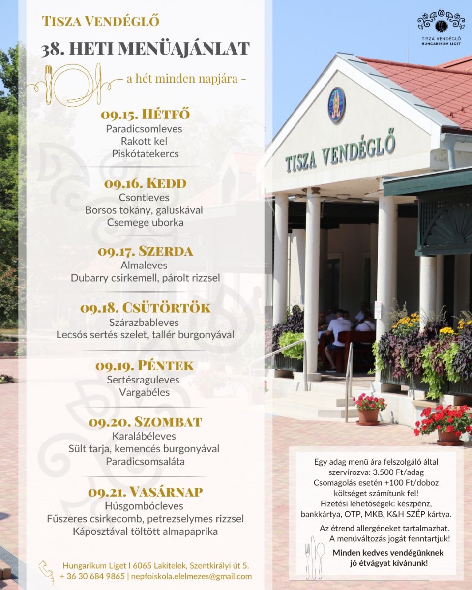 Tisza Vendéglő heti menü ajánlata 2025.09.15.-2025.09.21.