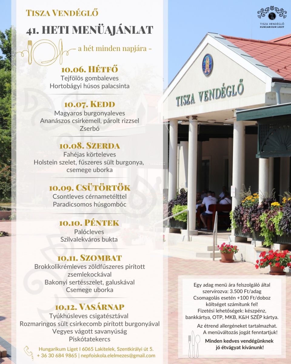 Tisza Vendéglő heti menü ajánlata 2025.10.06.-2025.10.12.