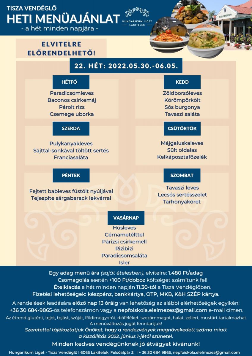 Ételkiadás: a hét minden napján 11.30-tól a Tisza Vendéglőben.