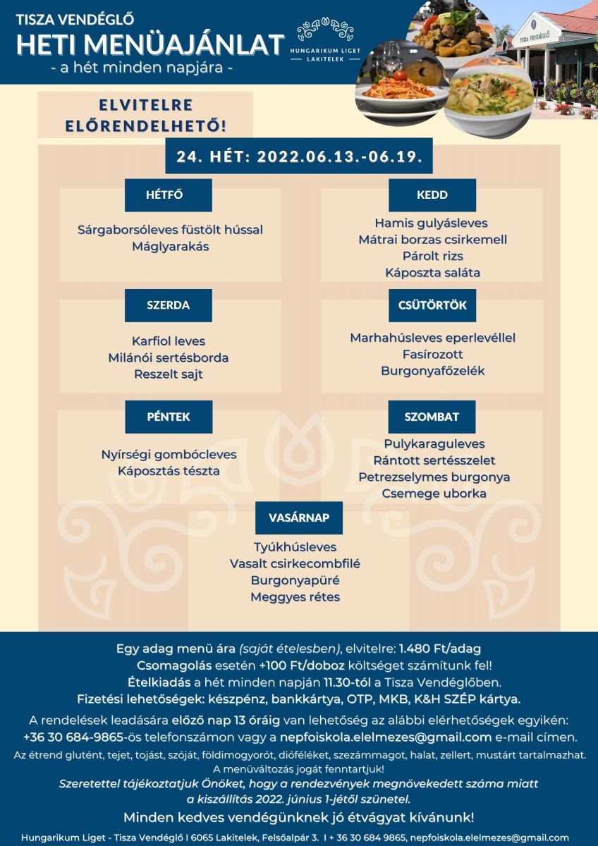 Ételkiadás: a hét minden napján 11.30-tól a Tisza Vendéglőben.