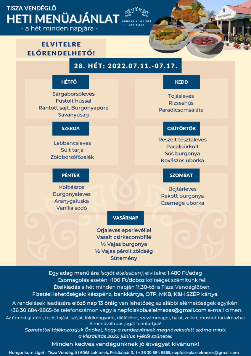 Tisza Vendéglőnk heti menü ajánlata 2022.07.11.-07.17.