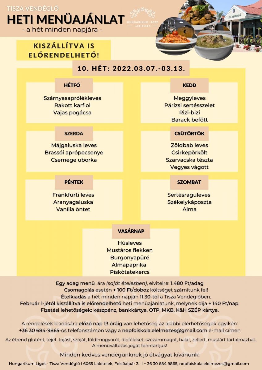 Ételkiadás: a hét minden napján 11.30-tól a Tisza Vendéglőben.