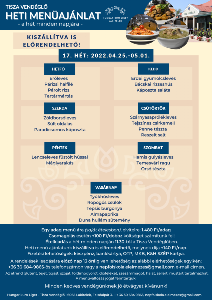 Ételkiadás: a hét minden napján 11.30-tól a Tisza Vendéglőben.