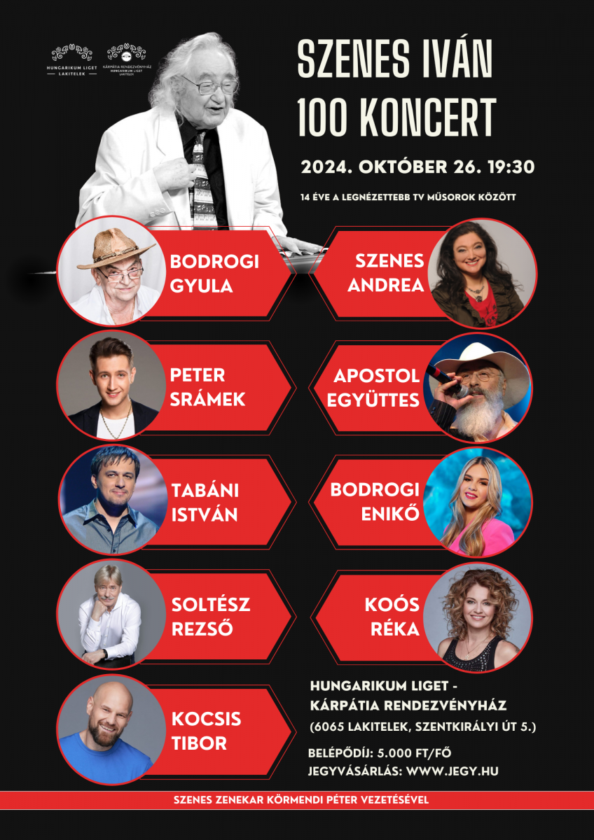 Szeretettel várjuk Önöket 2024. október 26-án, a lakiteleki Hungarikum Liget - Kárpátia Rendezvényházába, ahol Szenes Iván 100 koncert keretein belül csendülnek fel régi örökzöld dallamok.