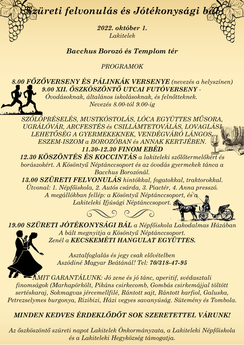 A lakiteleki óvoda szervezésében október 1-jén megrendezésre kerül a szüreti felvonulás és az azt követő jótékonysági bál. Az eseményen a Hungarikum Liget is kiemelt szerepet kap, hiszen a szüreti felvonulás 1. állomásaként szolgál, ahol megtekinthetik az érdeklődők a Kösöntyű Néptánccsoport és a Lakiteleki Ifjúsági Néptánccsoport előadását. A délutáni rendezvények zárásaként szeretettel invitáljuk Önöket a szüreti bálba, amely a Lakodalmas Házunkban lesz.