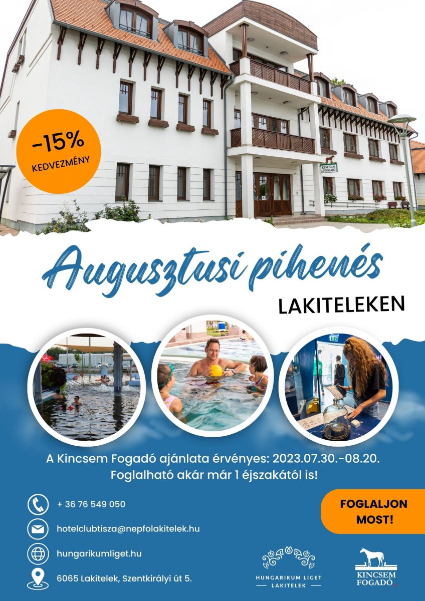 Közeledik az ősz, de még messze nincs vége a nyárnak. Pihenjenek a nyár utolsó hónapjában a lakiteleki Hungarikum Ligetben, foglaljanak szállást 15%-os kedvezménnyel a Kincsem Fogadóban.