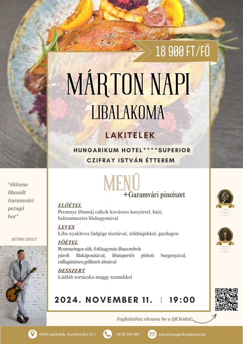 Márton-napi libalakománkon való részvételhez előzetes asztalfoglalás szükséges, melyet a +36 76 549 067 telefonszámon vagy az info@hungarikumhotel.hu e-mail címen tudnak megtenni. Az esemény ára 18 900 Ft/fő. SZÉP kártyát is elfogadunk!