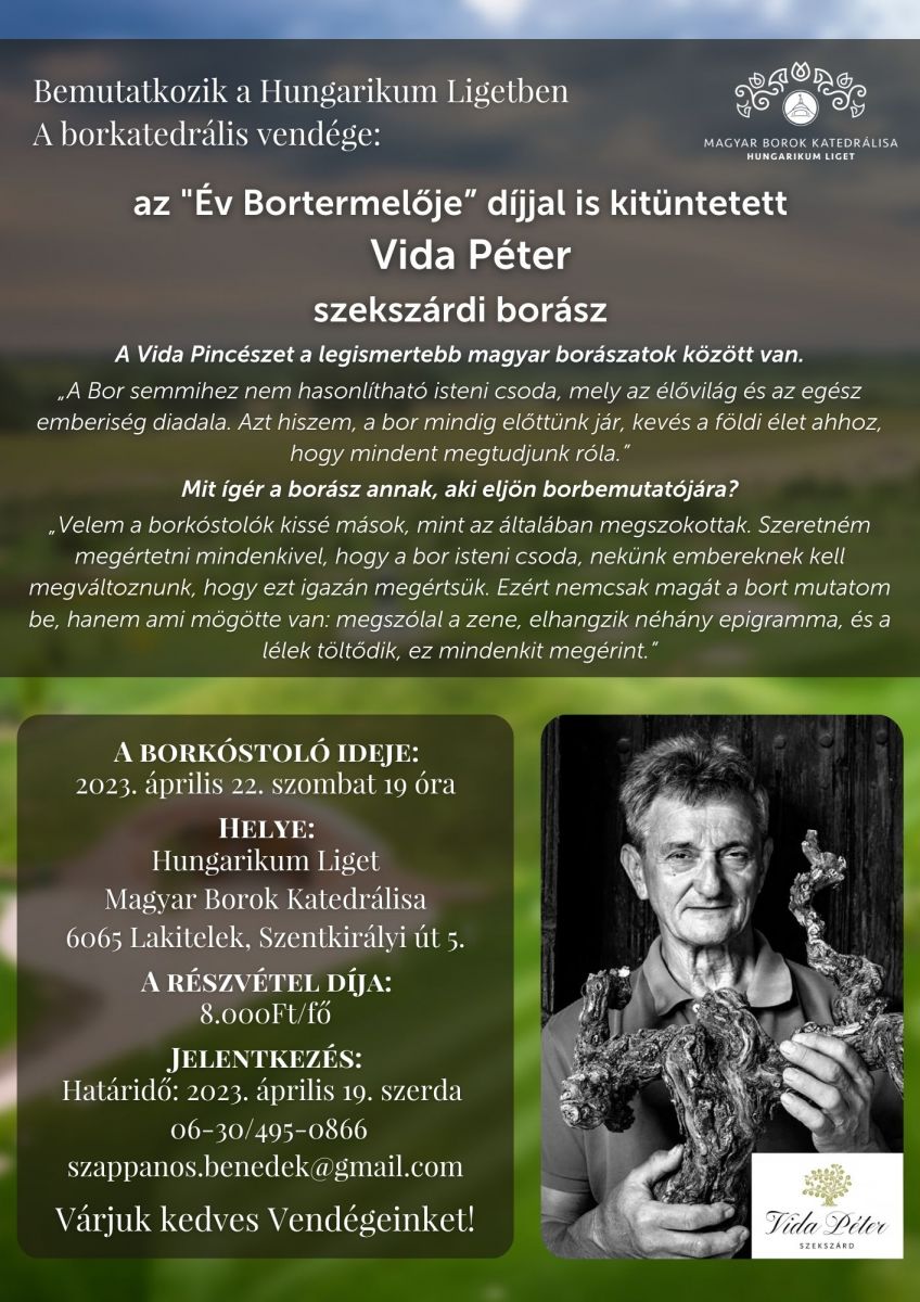 Szeretettel várjuk kedves Vendégeinket április 22-én a Magyar Borok Katedrálisában tartandó borestre, ahol bemutatkozik az "Év Bortermelője” Vida Péter szekszárdi borász.
