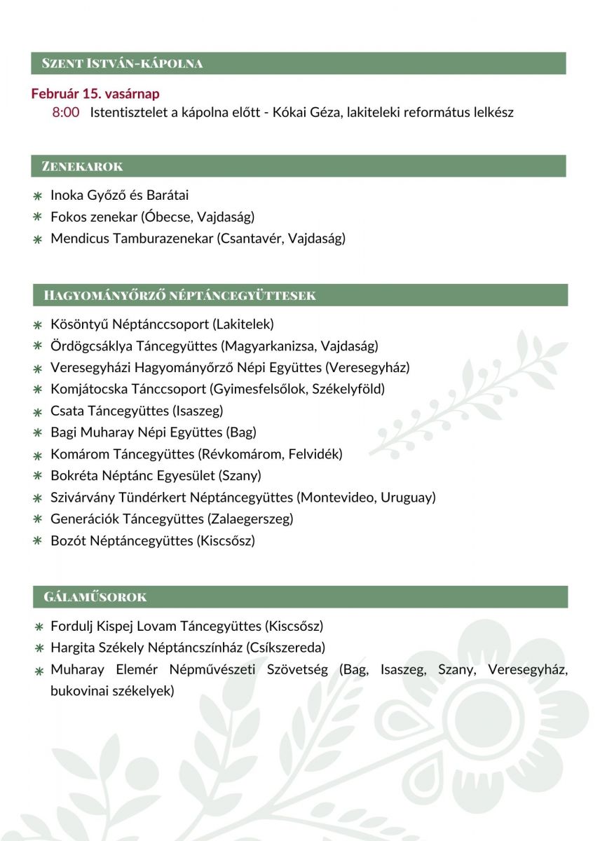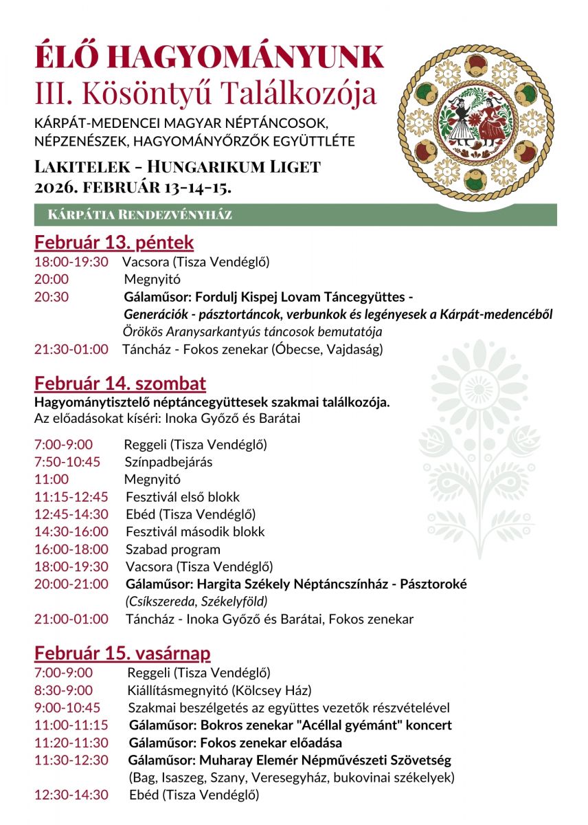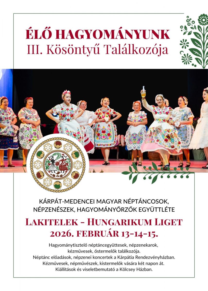 Kárpát-medencei magyar néptáncosok, népzenészek, hagyományőrzők együttléte 2026. február 13-14-15-én Lakiteleken, a Hungarikum Ligetben.