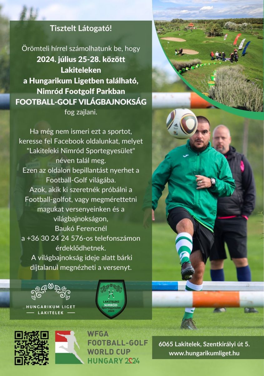 Örömteli hírrel számolhatunk be, hogy 2024. július 25-28. között Lakiteleken a Hungarikum Ligetben található, Nimród Footgolf Parkban Football-Golf Világbajnokság fog zajlani.