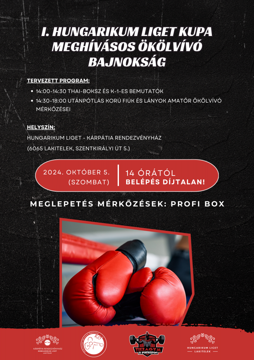 Szeretettel várjuk Önöket Lakitelekre, a Hungarikum Liget - Kárpátia Rendezvényházába 2024. október 5-én (szombat) az első meghívásos ökölvívó bajnokságunkra.